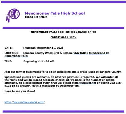 WELCOME TO THE MENOMONEE FALLS HIGH SCHOOL (WISCONSIN) CLASS OF 1962 WEB SITE!